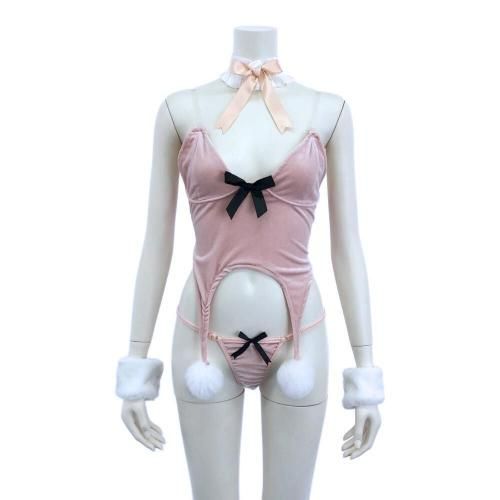 大胆に魅せつつもまるでマシュマロのようなバニーガール風セクシーコスプレ(SEXYCOSPLAY)。可愛らしいパステルピンクのベロア生地に、フワモコファーがまるでマシュマロのような触れたくなる柔らかデザイン♪丸みのある燕尾にしっぽを付けた可愛らしいバックスタイルとは対照的に、フロントデザインはウエストを逆U字にカットアウトし、先端にファーを付けることで動くたびに妖艶に揺れ下半身が大胆に露出。ブラックのリボンが全体を引き締め甘さの中にもクールさを感じるバニースーツには、コーディネートに網タイツやパンスト、さらにはボディスーツなどをインナーに合わせるなど変幻自在の楽しみ方もおすすめです♪