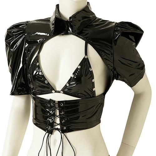エナメルの光沢感がハードプレイを予感させるバニーガール風セクシーコスプレ(SEXYCOSPLAY)。伸縮性のあるストレッチエナメルで仕立てられたボンデージ感あふれるセット。通常布で覆われている部分とは逆に大胆に露出した【逆バニースーツ】をイメージ。デコルテから二の腕まで覆うトップスは逆に隠すべきバストを大胆に露出し、インナーの三角ビキニがパートナーの視線を釘付けに。ボンデージ感溢れるスタッズや拘束着のようなベルトパーツやレースアップなどいつもの可愛らしいバニーとはひと味違うピリッとしたスパイスを効かせたディテールにも注目です。コスチュームには脚先までフェティッシュな雰囲気を漂わせるストッキングをセットにしてお届けします。