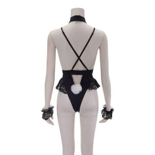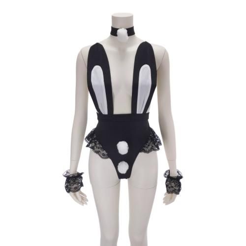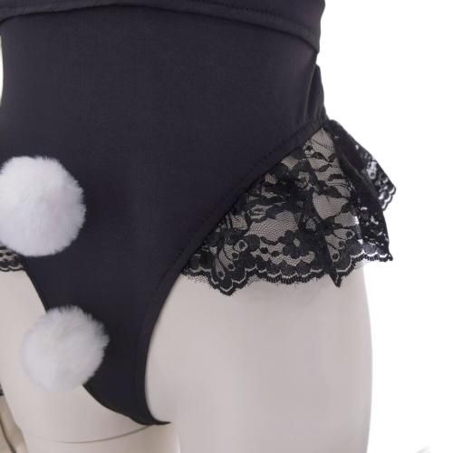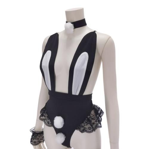 テディタイプのバニーガール風セクシーコスプレ(SEXYCOSPLAY)。ツルンとした生地にうさぎの耳をバストにあしらい、フリルのレースと前後に付いたファーのポンポンに、チョーカーがとっても愛らしい。クロッチはスナップボタンで着脱がしやすく、バックスタイルもマジックテープでスッキリしたデザインです。