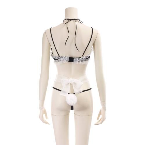 セクシーでコケティッシュなバニーガール&メイド風セクシーコスプレ(SEXYCOSPLAY)。ブラはほどよく伸縮性のある生地にレースを仕立て、フロント部分にレースアップを施しました。エプロンはシアー感の素材でキュートな印象に対し、透けて見えるオープンクロッチのショーツが大胆です。ブラは2列3段階のホック付きです。バニーガール必須アイテムのうさ耳カチューシャと尻尾にはふわふわなファーをあしらいセクシーなだけでなくキュートさも演出する充実したセット内容です。