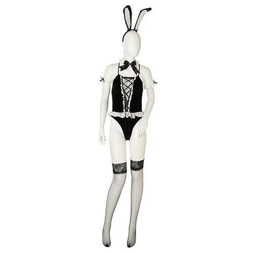レースアップから覗く素肌がコケティッシュなバニーガール風セクシーコスプレ(SEXYCOSPLAY)。しっとりとした肌触りで光沢のあるベロア生地を使用し、バストの切り込み部分に透け感たっぷりのメッシュとレースアップをあしらい大人の色気を放ちます。フリルやリボンを仕立てセクシーさの中にキュートな雰囲気も♪バニーガール必須アイテムのうさ耳カチューシャに足先までセクシーに飾る網タイツのニーハイがセットになったアイテムです。クロッチのスナップボタンは着脱を容易にサポートします。