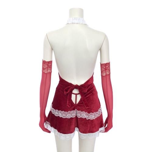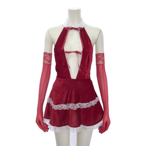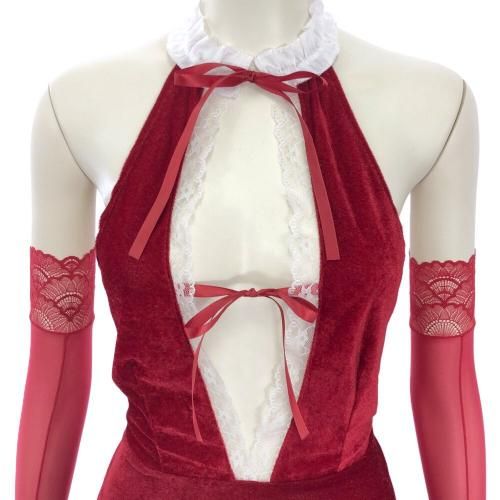 胸元のリボンが優艶な危うさを演出するサンタガール風コスプレ(COSPLAY)。Aラインのふんわりスカートにレースやフリルがフェミニンなワンピ。首元からウエストまでカットアウトされ、バストを寄せて結んだリボンからは谷間をアピール。バックスタイルは腰ギリギリをリボンで結んだシンプルデザインで、ひとつひとつリボンを解くパートナーのテンションも上がりそう♪ロンググローブはストッキングの様なスベスベ素材が独特な触感でフェチさんには堪りません。