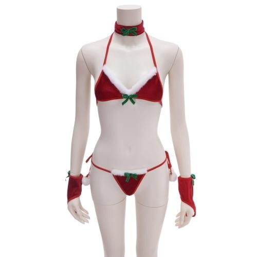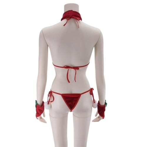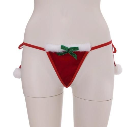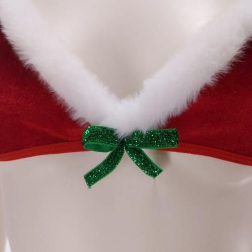 小さな面積でセンシャルなブラショーツセットサンタガール風セクシーコスプレ(SEXYCOSPLAY)。女性らしさ溢れるキュートなふわもこ素材三角ブラにポンポン付き紐ショーツがパートナーの期待に添える濃密な時間を過ごせそう。