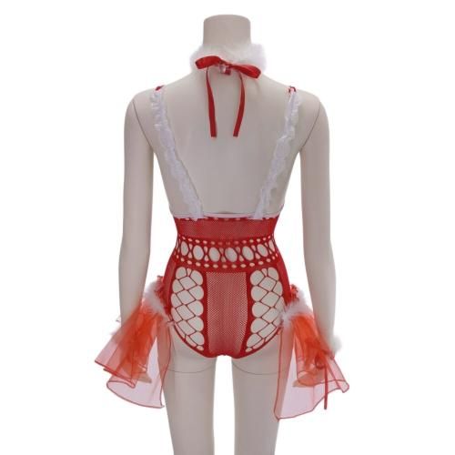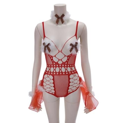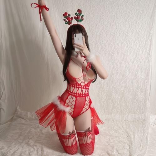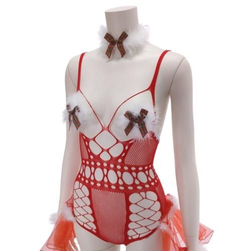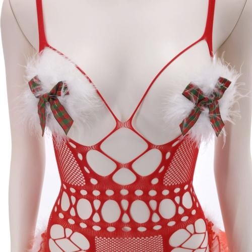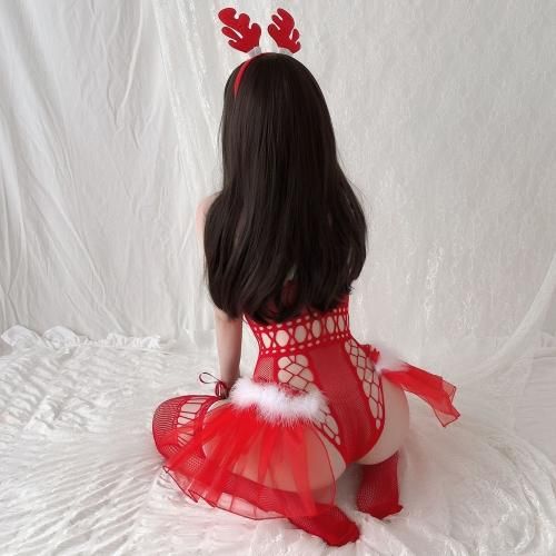 ファー二プレス付きボディストッキングサンタガール風セクシーコスプレ(SEXYCOSPLAY)。チェック柄トナカイカチューシャに、ふんわりチュールがキュートながらボディラインを強調したオープンバストでしっかりセクシー。ファーの二プレスでさらにセンシュアルに♪