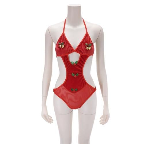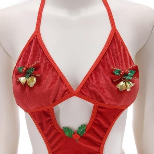 幾つもの鈴がシャンシャンと奏でるサンタガール風テディセクシーコスプレ(SEXYCOSPLAY)。ベロア×透け感シフォンのテディ。ホルターネックと、ウエストのカットアウトデザインが程よい肌の露出でウエストを華奢に見せてくれます。