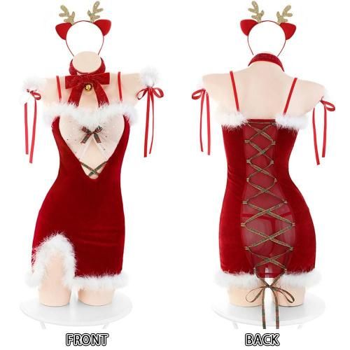 セクシーと可愛いを実現できるサンタガール風セクシーコスプレ(SEXYCOSPLAY)。胸元にはメッシュ生地にキラキラした星や月のスパンコールを散りばめ、ファーやクリスマス感たっぷりのリボンなどをあしらいキュート&セクシーを叶えるアイテムです。ヒップが隠れる着丈にスリットが入りバックスタイルは中心にメッシュ生地を仕立てることでTバックショーツが透けて見え、レースアップはサイズ調節が可能なのでボディラインを魅力的にし、煌びやかな印象も作ります。グリッターのついたチョーカーやカチューシャはより気分を高め、ニーハイストッキングは大き目のサテンリボンが目を引き全身を愛らしく見せてくれます。