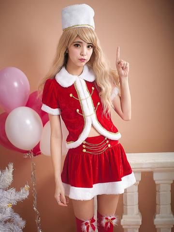 くるみ割り人形みたいなデザインがかわいいサンタガール風セクシーコスプレ(SEXYCOSPLAY)。ナポレオンジャケットを想起させるようなダブルブレストのボタンから伸びるゴールドのチェーンがお洒落でかわいいサンタガール。おへそがチラっと見える前開きのトップスとミニ丈のスカートの組み合わせでセクシーアピールもバッチリ♪トップスと帽子には金ラメのコード刺繍でライン装飾が入っているなど細部にもこだわりが詰まった一着。クリスマスシーズンにはこの1着で可愛く変身!聖夜のファンタジー「くるみ割り人形」の様に素敵なイブが訪れる予感♪トップスはフロントがホック留めで全開になるほか、スカートはサイドファスナーが付いていますので着るのも楽ちんでオススメです。