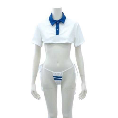 大人になった今だからこそ夢が叶う体操着風セクシーコスプレ(SEXYCOSPLAY)。部活で?いた汗の香りが懐かしく、青臭い青春の日々が蘇る白とブルーのさわやかな体操着コスプレ。究極までショート丈にしたポロシャツのアンダーからは下乳が覗き、スポーティラインが入った超ハイレグのサイドストリングショーツからは、ヒップが大胆に露出。ショーツのストリングを解く指先に抑えられない欲望が伝わる。また、セットのニーハイストッキングは、見た目の可愛らしさだけではなく触覚からも刺激を受ける隠れた名脇役。大人の時間を存分に楽しんで♪