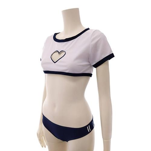 バストのハートカットが視線を集中させるキュートさとスポーティーさが際立つ体操着&ブルマ風セクシーコスプレ(SEXYCOSPLAY)。伸縮性が高い生地を使用したリンガーデザインのミニ丈トップスは視線をバストに集めるハート型のくり抜きがキュートかつセクシーなデザインです。ブルマはビキニタイプで白いスリーラインが爽やかさを引き出し、ヒップにはうさぎを連想させるボブテイルがついて、スポーティコスチュームに可愛いさをプラス。