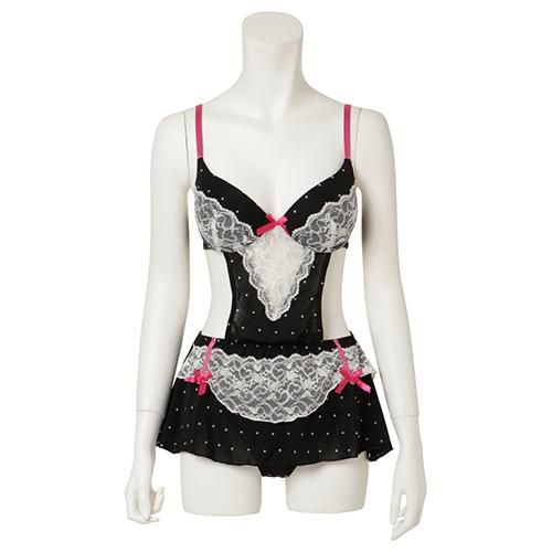 ドットとレースが乙女心をくすぐるメイド風セクシーコスプレ(SEXYCOSPLAY)。ドット柄の生地にたっぷりレースとピンクのリボンを飾った、女の子が大好きなものだけを集めたキュートなデザイン♪ブラ部分はワイヤーと内蔵パッド入りで、しっかりバストを寄せ上げセクシーさも忘れません!背中のホックは2個留め3段階調節可能。
