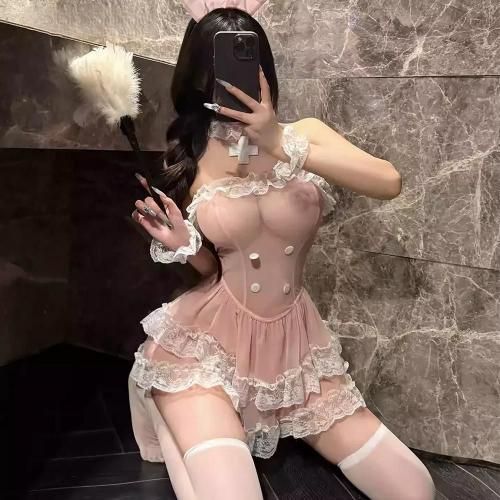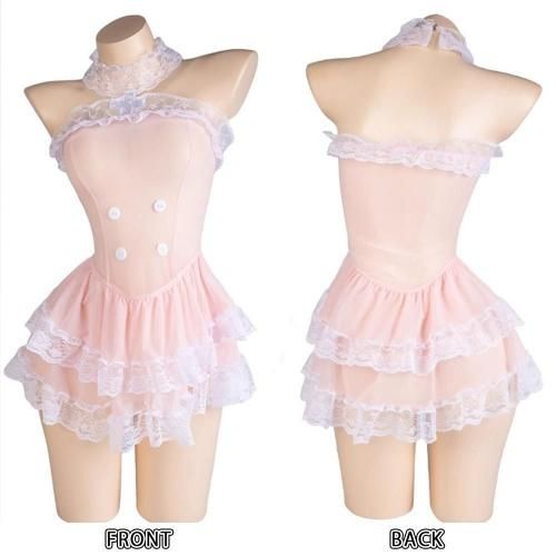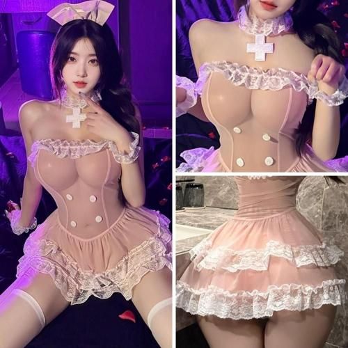フリル&レースのエロとロマンなスケスケナース風セクシーコスプレ(SEXYCOSPLAY)。淡いピンクと白いレースがフェミニンで、フロントのボタンがナースを連想させるベアワンピのナースコスプレ。素肌が透けるシースルー素材にふんわりとしたフリルが動くたびに揺れ、甘くロマンチックな雰囲気を醸し出しています。肩を露出させることで女性らしさを強調し、コルセットデザインがボディラインを美しく魅せることで、甘くロマンティックなだけじゃなくしっかりセクシーにパートナーを夢中にさせる♪