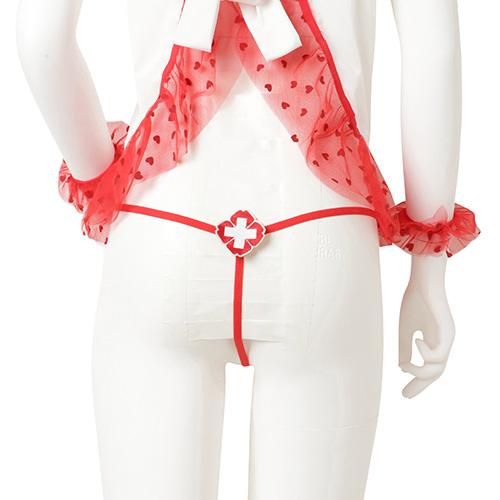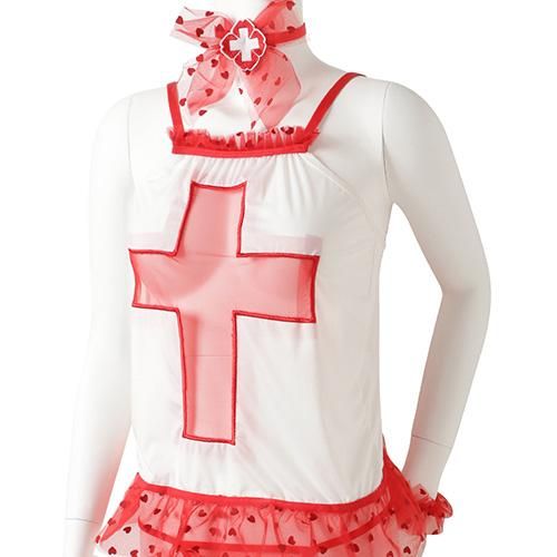 着丈の短さから見せるヒップ周りとふわふわチュールが色気とのギャップを演出するナース風セクシーコスプレ(SEXYCOSPLAY)。肌触りの良い光沢のあるホワイトの生地にレッドのチュール生地を掛け合わせた裸エプロン風のナース風セクシーコスプレです。チュール生地にはハートデザインをあしらいキュートさをプラスし、フロント部分にはナースを連想させる十字架を仕立て生地越しにバストラインが露になり透け感を楽しめます。バックスタイルはヒップラインが露出されるほどの短さに見ている方も着ている方もドキドキ感が楽しめて気分も上がること間違いなし♪