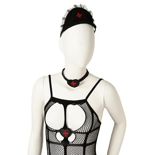 カットされた部分と網目から素肌が露になりセクシーさを引き出す小悪魔ナース服風セクシーコスプレ(SEXYCOSPLAY)。伸縮性に富んだ生地はボディラインを美しく演出します。バストとクロッチ付近は大きく開いておりカットから露出されるバストや、セットのオープンショーツでよりセクシーさを強調します。カラーもダーク調になっており白衣の天使ではなく小悪魔風のナースをお探しの方にピッタリです。