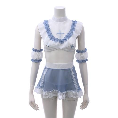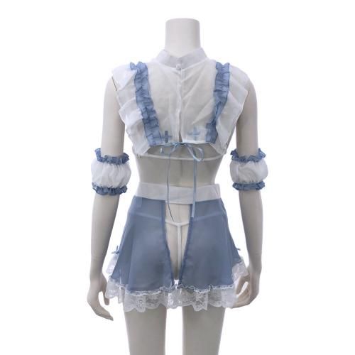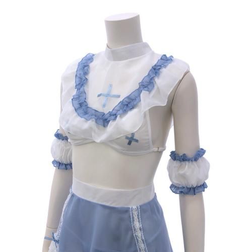 激しいギャップに発熱しそうなナース風セクシーコスプレ(SEXYCOSPLAY)。ライトブルーの天使のような清楚な色合いや、フリル、レースのキュートデザインからは想像がつかない、大胆過ぎる肌魅せが魅力的で興奮注意な衣装☆透けたバストやヒップが露わになったバックスタイルでパートナーを刺激します。