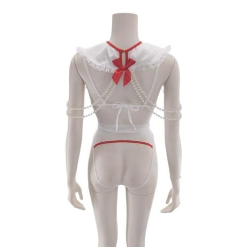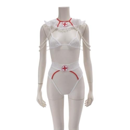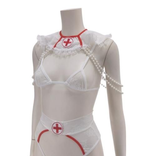 小面積で露出多め♪かわいく攻めるタイプのナース風セクシーコスプレ(SEXYCOSPLAY)。定番ナースコスチュームをギリギリまでコンパクトに、また大胆デザインにしました。パールをたっぷり施したマイクロミニトップスに、小さなブラ、究極はオープンクロッチ&Oバックのショーツと、セクシーにもほどがある、という内容。興奮ポイント満載のセットです。