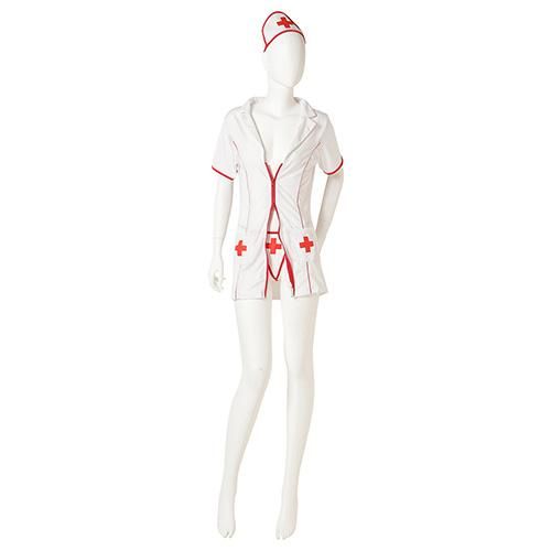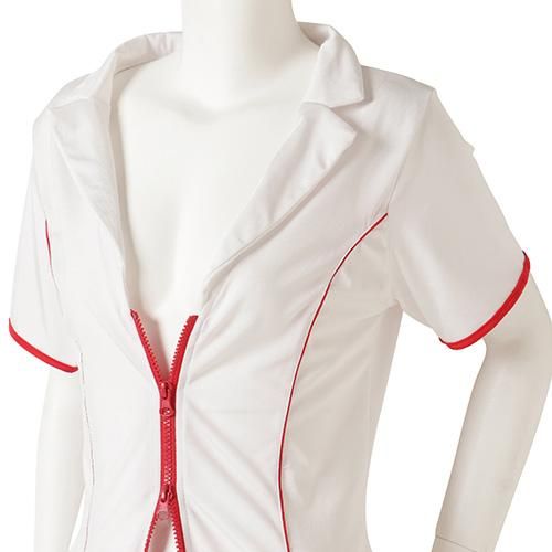 ダブルジップ使いで好みの肌見せを楽しめるセクシーなナース風セクシーコスプレ(SEXYCOSPLAY)。ヒップラインギリギリの超ミニ丈のワンピースはストレッチ素材でボディにフィットしベースのホワイトにレッドカラーを入れスッキリとした印象を作り色気溢れるナースを演出。深めのVカットに上下からのダブルファスナーでお好みのオープン具合を楽しめ、ナースのシンボルをショーツにもあしらい見え隠れする様はよりパートナーの興味を引くこと間違いなし♪