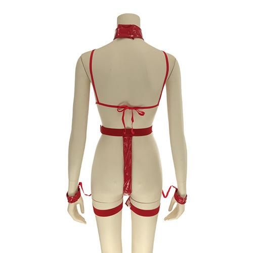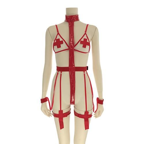ボンテージ風が色気溢れ出る露出系ナース風セクシーコスプレ(SEXYCOSPLAY)。エナメル素材をチョーカーと一体型になったガーターランジェリーに使用。ショーツ部分としての役割も有り露出に磨きがかかった存在感抜群のアイテムです。拘束風のデザインでもあるのでハード過ぎないデザインは挑戦しやすいのもポイント♪ガーターベルトは大きな十字架のモチーフを仕立て裏側にベルトがついており、お好みのストッキングがずれにくくなるのもgood♪付属の大きなヘアリボンはハードさの中にキュートさも演出しやりすぎないバランスの取れたデザインです。