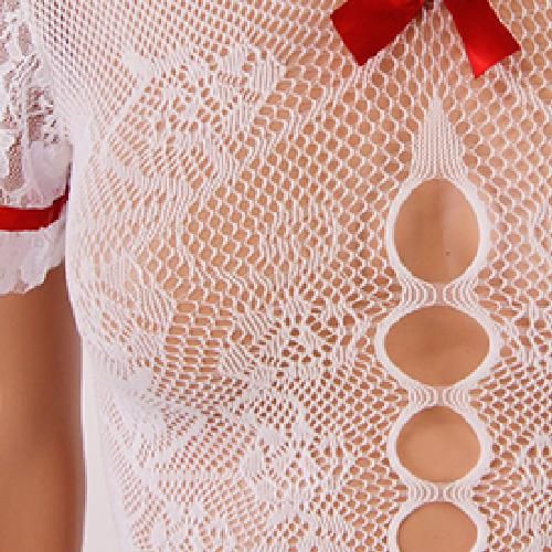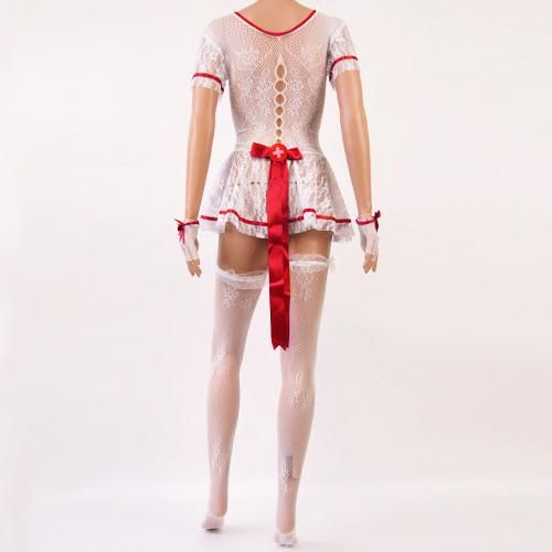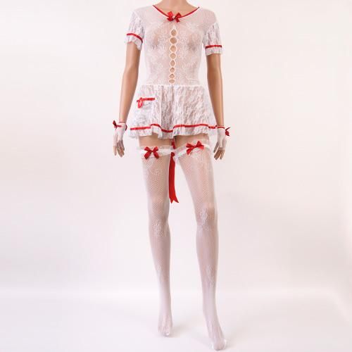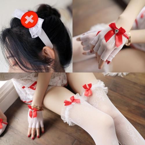 リボンとレースでアイドル風にかわいいナース風セクシーコスプレ(SEXYCOSPLAY)。透け感を楽しむ網タイツ生地とレースの半袖ワンピースで可愛くセクシーにナースに変身できちゃうコスプレセット。透け感は強いですが愛らしく柔らかな雰囲気で、コスプレ初心者さんもはじめやすいデザインです♪