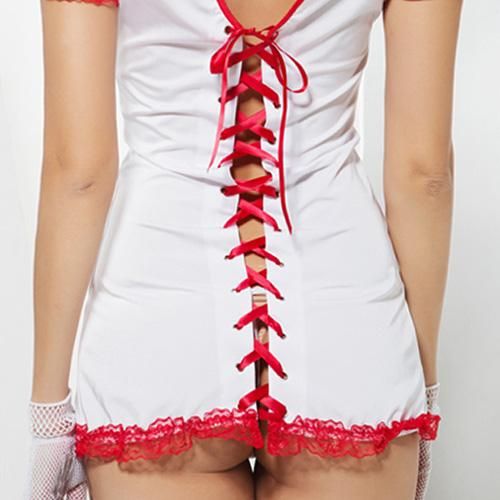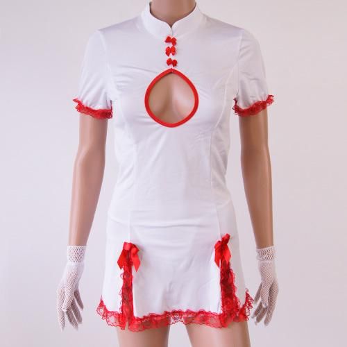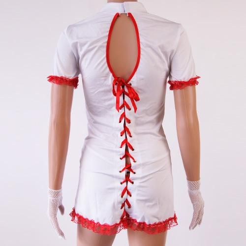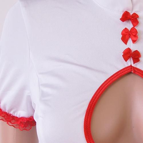 短め丈でチラ見せしちゃうナース風セクシーコスプレ(SEXYCOSPLAY)。清楚な白に情熱的な赤の差し色が映える短め丈のチャイナドレス風ナースコスプレ。大きく開いた胸元と背中のレースアップがセクシー度UPのポイントです♪