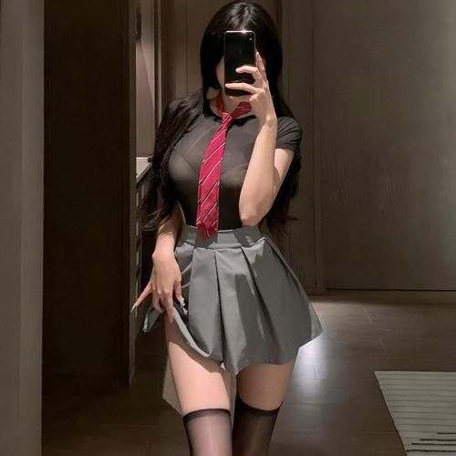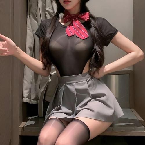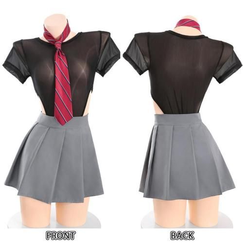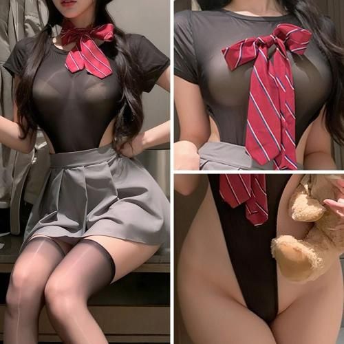 挑発的なスクールガール風セクシーコスプレ(SEXYCOSPLAY)。シースルーから透けた肌、カットアウトされたサイドウエストからはヘルシーな素肌が覗き、ヒラリと揺れるプリーツスカートは太ももが大きく露出するほどのミニ丈デザイン。そして、あどけなさの残るスカートを脱ぐと、ボディラインが強調された超ハイレグの大胆セクシーなテディ姿に。エンジのネクタイは身に着けるのはもちろん、目隠しとして視界の自由を奪ったり、手首などを縛って拘束プレイにも♪テディはクロッチ部分に2列3段のホック付き。スカートはウエストにマジックテープを使用し、ムードを壊すことなく簡単脱着が可能です。