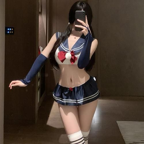 ミニ過ぎるスカートからヒップを大胆に露出した学生服風セクシーコスプレ(SEXYCOSPLAY) 。セーラーカラーがキュンと来るトップスは2列3段ホックで着脱しやすく、取り外せるポンポン付きの赤いリボンがアクセント。無邪気な少女らしさを感じつつもヒップ丸見えの大胆マイクロミニ丈スカートがちゃんとセクシーで、可愛らしさとセクシーさのバランスが◎長めのアームカバーが素肌とのコントラストを楽しめます♪フロントもバックスタイルも、どこから見ても抜け目のないデザインです。