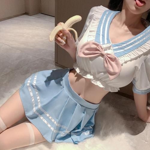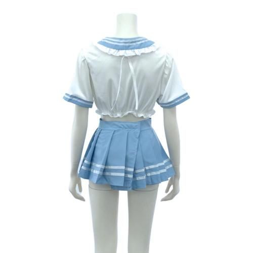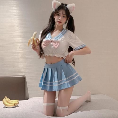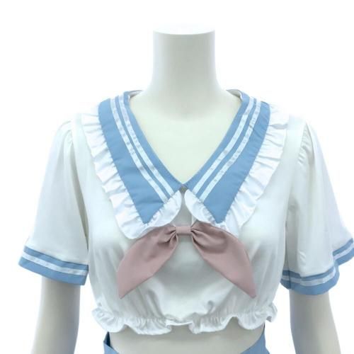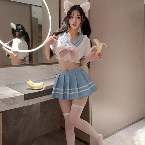 甘酸っぱくてキュートな猫耳セーラー服セクシーコスプレ(SEXYCOSPLAY) 。純白に淡いブルーが爽やかで、襟にフリルを施した幼さの残るキュートなセーラーコスプレ。ショートトップスのギャザーウエストがバストを強調し、可愛いだけではないセクシーな魅力を放ちます。プリーツミニスカートは着脱しやすいマジックテープで受け入れ態勢バッチリ♪そして鈴付きのふわふわねこ耳カチューシャを身に着ければ、気まぐれ猫ちゃんに可愛く変身できちゃう♪