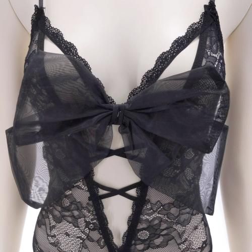 大きなリボンモチーフオープンクロッチセクシーテディ(SEXYTEDDY)。花柄レースにリボンのアクセントがキュート。そのキュートなイメージを覆す大胆なオープンクロッチデザインがパートナーをドキッとさせてくれる。ハイレグで脚長効果とセクシーの一石二鳥なテディで、濃厚な時間を過ごして。