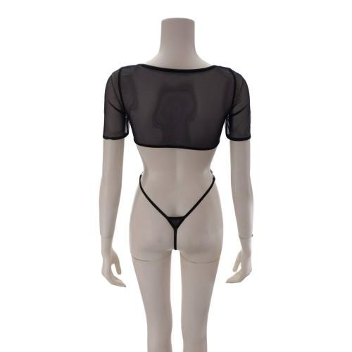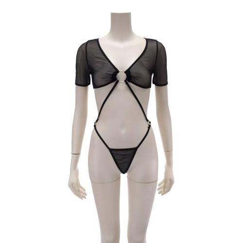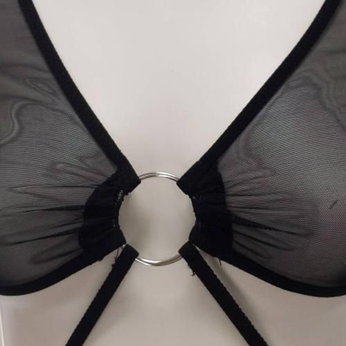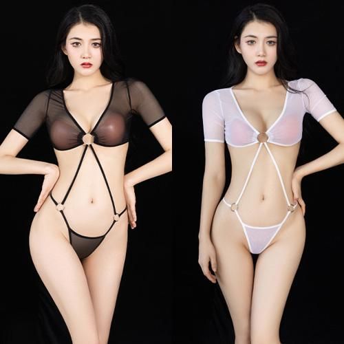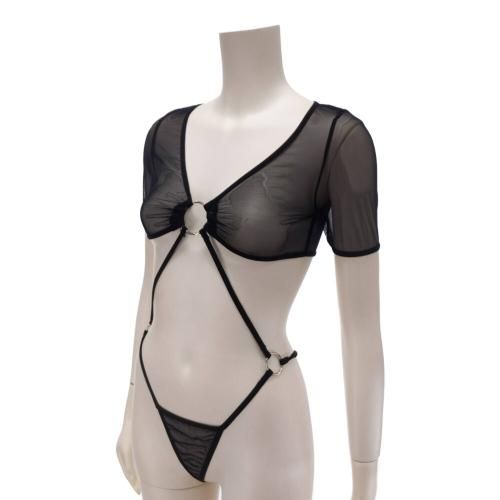 透け感のあるシアー素材のトップスと同じ生地のショーツが一体になり、それぞれをリングと華奢なストリングで結んだ恥じらいあるデザイン。だからこそ刺激が全身に伝わりやすくその姿を眺めていたくなる一点です。